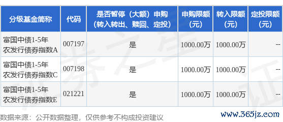本站消息,6月19日富国基金管理有限公司发布《关于富国中债1-5年农发行债券指数证券投资基金暂停大额申购、转换转入及定期定额投资业务的公告》。公告中提示,为了保证基金的平稳运作铭创配资,保护基金持有人的利益,自2025年6月19日起富国中债1-5年农发行债券指数证券投资基金暂停大额申购、转换转入及定期定额投资业务,下属分级基金调整明细如下: