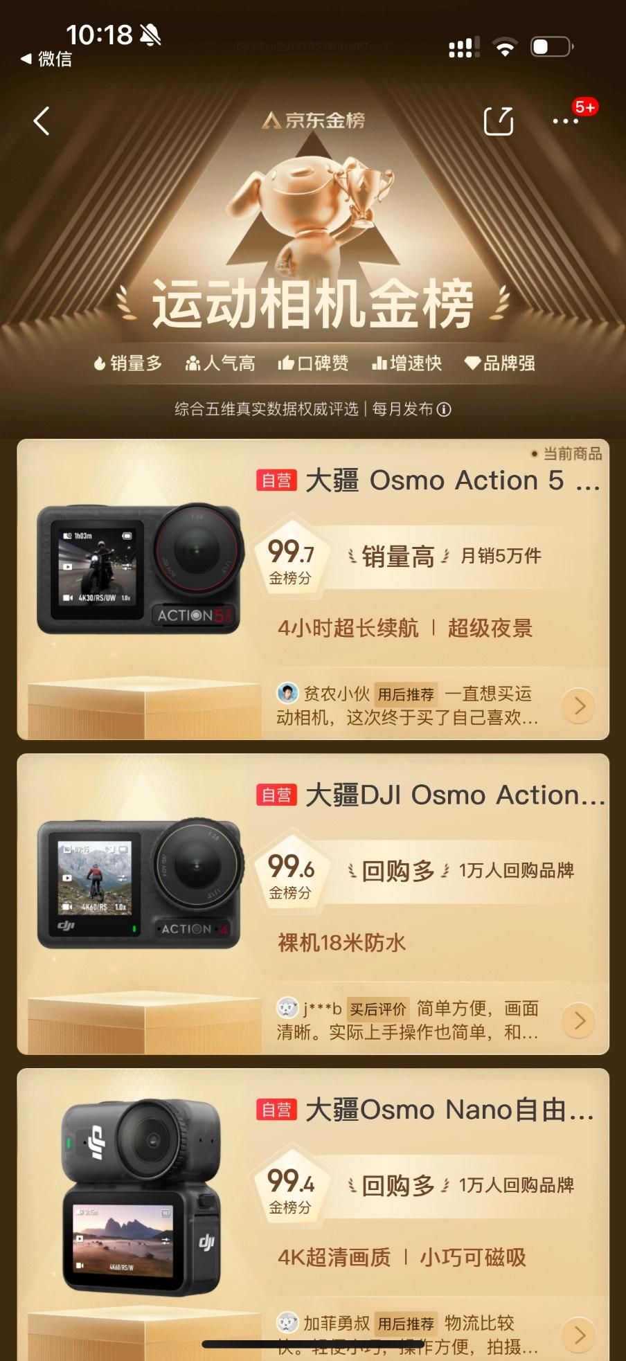 京东“运动相机金榜”显示,大疆Osmo Action 5 Pro等三款产品包揽前三,进入“大疆时间”。在“户外全景运动相机热卖榜”中,大疆Osmo 360发布不到3个月便登顶,且占据榜首49天。
